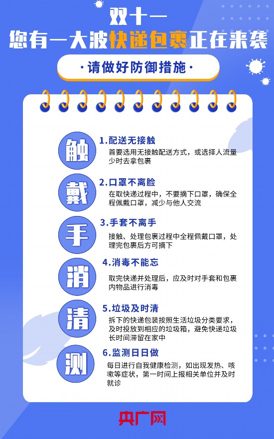 随着“双十一”的结束,一大拨快递包裹也在到来的路上。近日,全国多地商品新冠病毒检测结果呈阳性,央广网提醒广大网友,沉浸于拆快递快乐的同时一定要做好疫情防护工作。