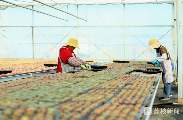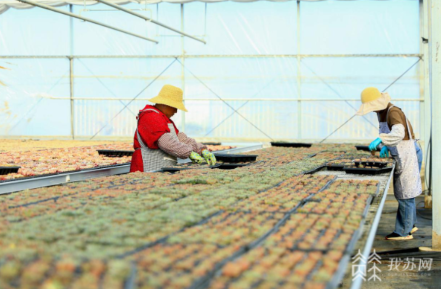 睢宁县梁集镇花卉产业园内工人对多肉植物进行管护