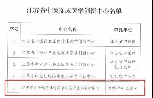 近日,江苏省中医药管理局公布了全省五家中医临床医学创新中心的名单,无锡市中医医院作为唯一一家宁外地市级医院摘得了“江苏省退行性骨关节病临床医学创新中心”的称号。