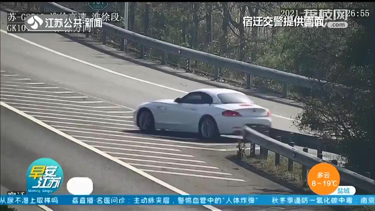 从视频监控中可以看到,当天上午11点多,在徐淮高速洋河服务区周边路段,一辆白色轿车在错过服务区匝道后,竟开始往后倒车。