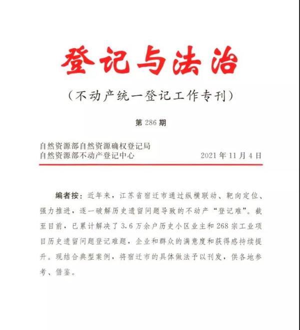 今天,记者从省自然资源厅获悉,我省宿迁市通过纵横联动、靶向定位、强力推进,逐一破解历史遗留问题导致的不动产“登记难”,企业和群众的满意度和获得感持续提升。本月,自然资源部确权登记局、不动产登记中心《登记与法治》第286期将宿迁市的具体做法予以刊发,供全国各地参考、借鉴。