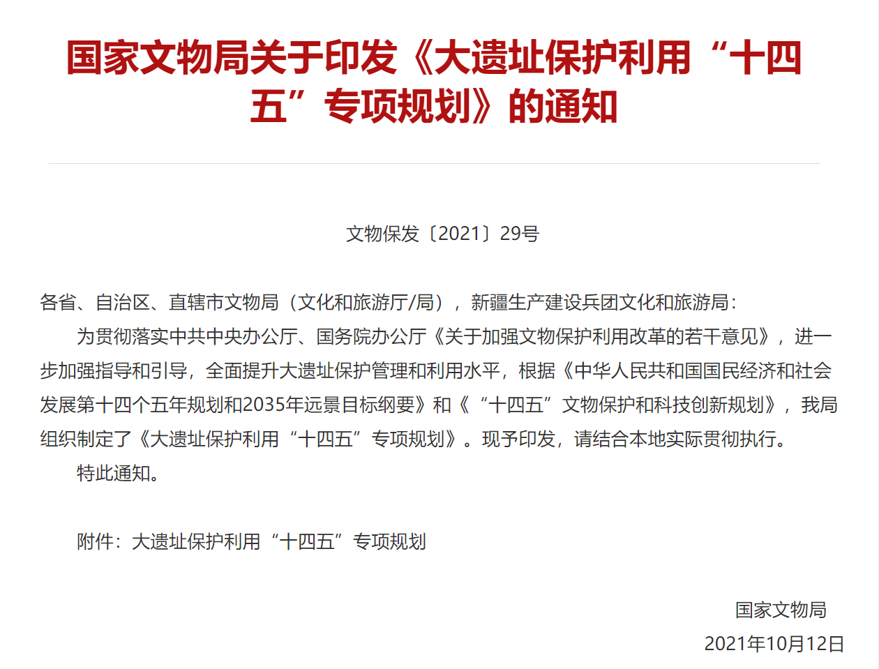 为贯彻落实中共中央办公厅、国务院办公厅《关于加强文物保护利用改革的若干意见》,进一步加强指导和引导,全面提升大遗址保护管理和利用水平,根据《中华人民共和国国民经济和社会发展第十四个五年规划和2035年远景目标纲要》和《“十四五”文物保护和科技创新规划》,我局组织制定了《大遗址保护利用“十四五”专项规划》。现予印发,请结合本地实际贯彻执行。