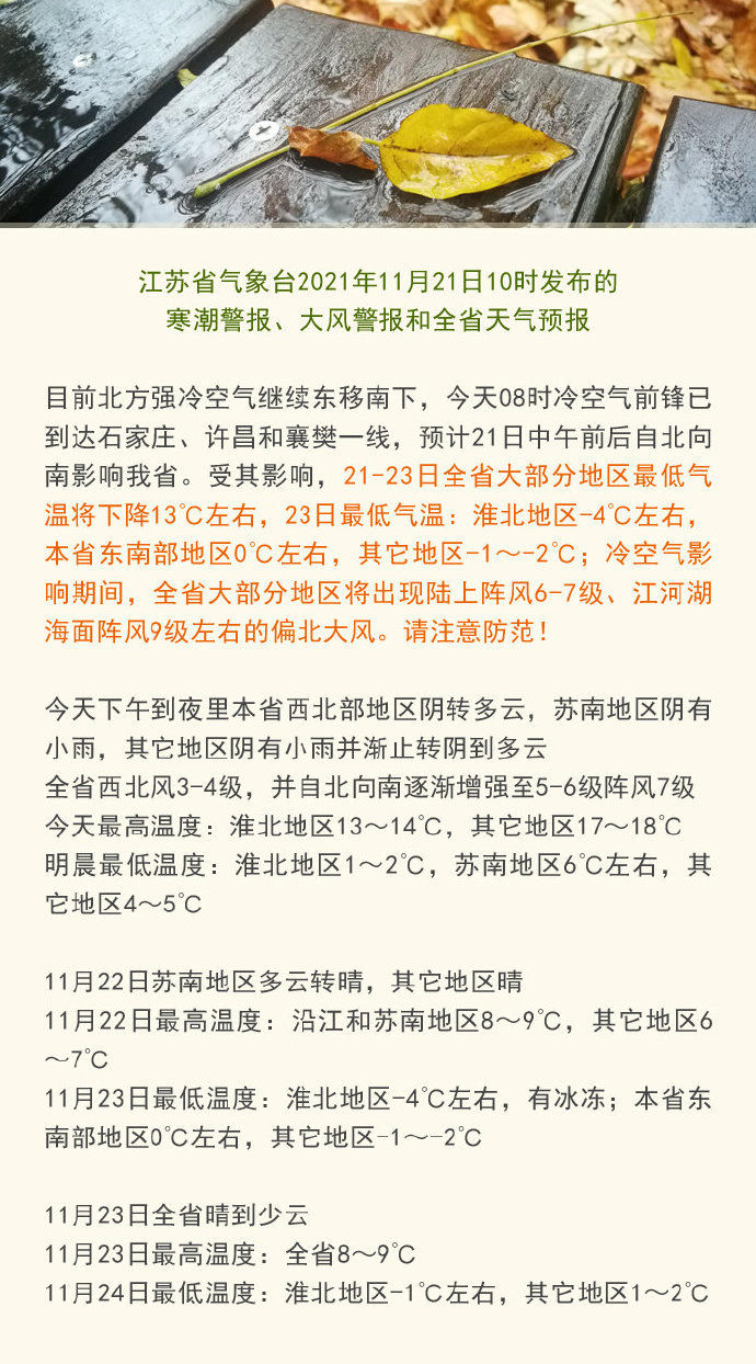 今天下午到夜里本省西北部地区阴转多云,苏南地区阴有小雨,其它地区阴有小雨并渐止转阴到多云;全省西北风3-4级,并自北向南逐渐增强至5-6级阵风7级;今天最高温度:淮北地区13~14℃,其它地区17~18℃;明晨最低温度:淮北地区1~2℃,苏南地区6℃左右,其它地区4~5℃。