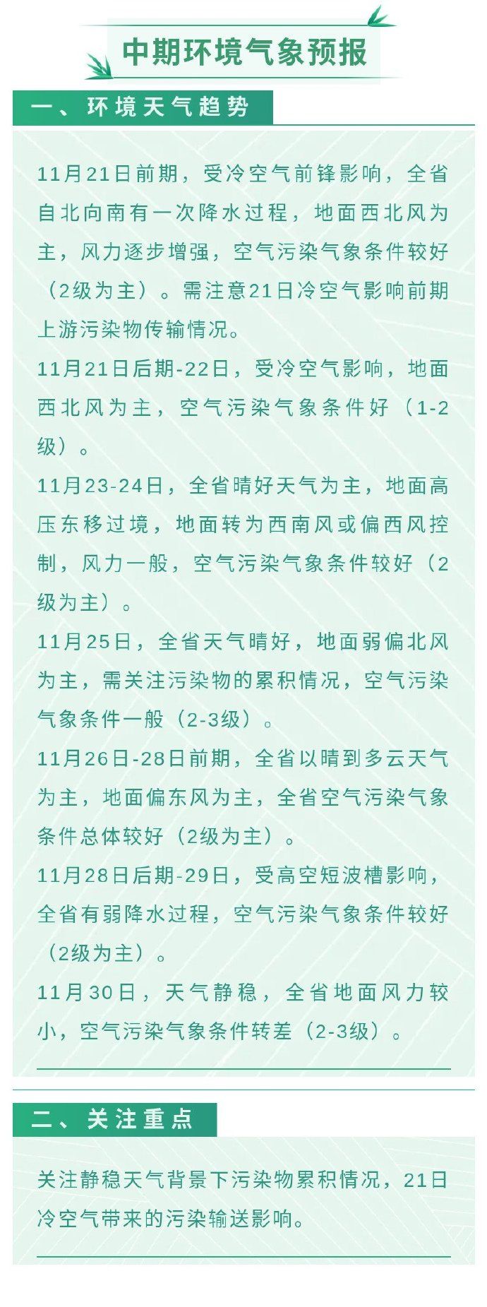 21日前期,受冷空气前锋影响,全省自北向南有一次降水过程,地面西北风为主,风力逐步增强,空气污染气象条件较好(2级为主)。需注意21日冷空气影响前期上游污染物传输情况。21日后期-22日,受冷空气影响,地面西北风为主,空气污染气象条件好(1-2级)。