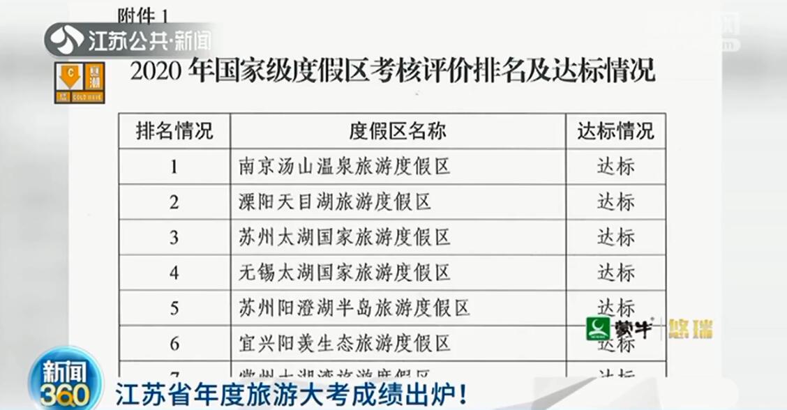 《2020年度旅游度假区总体考核评价报告》对江苏省56家省级以上度假区进行了考核排名。南京汤山温泉等55家旅游度假区考核达标,个别旅游度假区考核未能达标,被督促抓好整改工作。