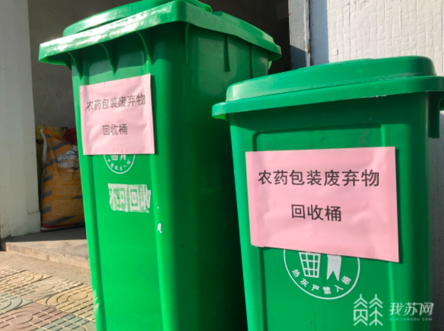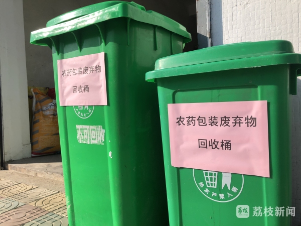 日前,记者在邳州市八路镇农药包装废弃物回收站看到,门口放着两个农药包装废弃物回收桶,一个用于存放农药包装废弃瓶、一个用于存放农药包装废弃袋。
