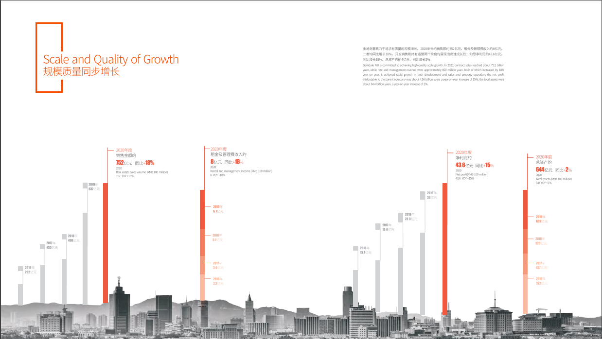 根据公司官方数据显示,金地商置2020年度合约销售额约752亿元,租金及管理费收入约8亿元,二者均同比增长18%,开发销售和持有运营两个维度均展现出高速成长性;归母净利润约43.6亿元,同比增长15%;总资产约644亿元,同比增长2%。2020年度营业收入达163.2亿元,同比上升39%;归属股东净利润达43.5亿元,同比上升15%;营收及归母净利双双创下历史新高。