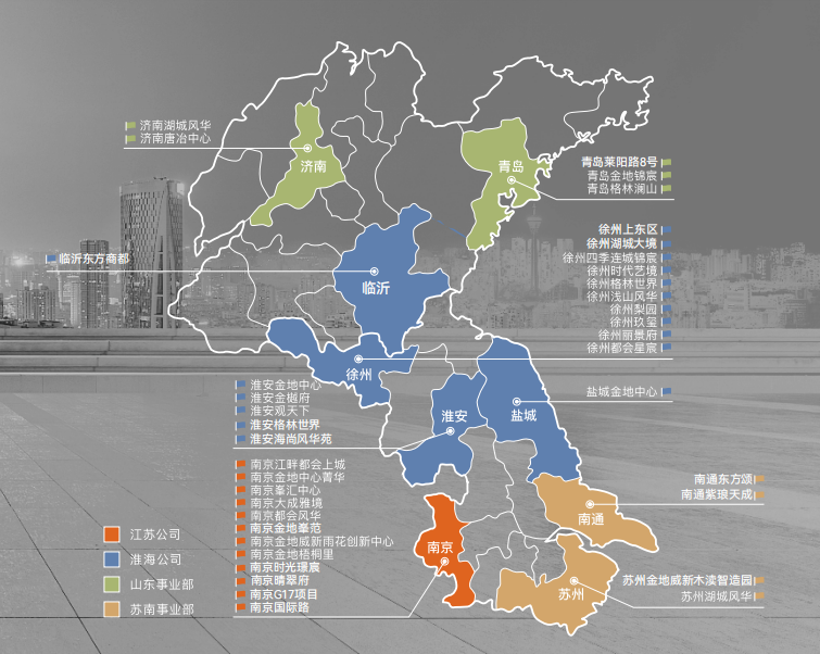 如今,金地商置东部区域深耕江苏、山东两省活力城市群,“6年9城38作”的战略版图已经成型,物业形态涵盖精品住宅、城市公寓、大型Mall、超甲级写字楼、产业园镇等。