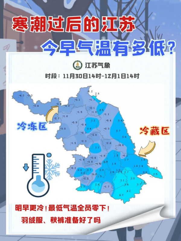 淮北北部地区-3到-4℃,最低-4.3℃(丰县),苏南地区2-3℃,其它地区0到-1℃。