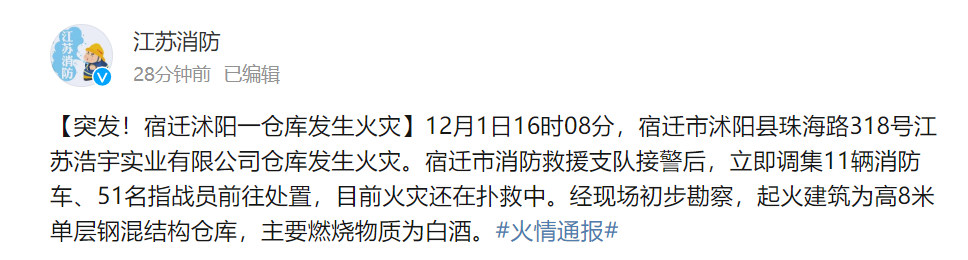 我苏网讯 据江苏消防,12月1日16时08分,宿迁市沭阳县珠海路318号江苏浩宇实业有限公司仓库发生火灾。宿迁市消防救援支队接警后,立即调集11辆消防车、51名指战员前往处置,目前火灾还在扑救中。经现场初步勘察,起火建筑为高8米单层钢混结构仓库,主要燃烧物质为白酒。