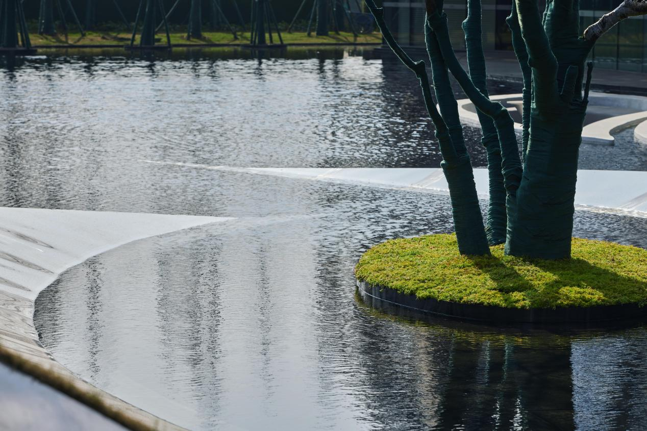 就景观而言,设计师把建筑与自然看作一个整体世界,水元素扮演着关键的设计元素, 平静宽广的透过水面映像的天空,精心挑选的植被,生长着四季变化,绿树, 建筑与人的倒影层层迭迭的形成一幅美景,人在迈入建筑的刹那,即感受大自然的亲昵与舒适。