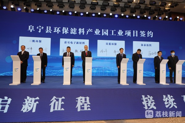 会上,中国产业用纺织品行业协会授予阜宁县环保新材料产业园“十三五”优秀公共服务平台称号。阜宁还举行了绿色低碳产业示范园创建启动仪式,该园区将对绿色低碳与产业数字化进行整合,面向园区企业等客户,全力打造“绿色低碳+环保新材料+数字化+智能化”的低碳示范园区。随后,一批亿元以上环保新材料重大产业项目在会上完成签约。