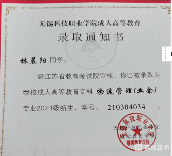 无锡顺丰速运点部快递员林晨阳,拥有丰富的物流管理经验,但学历却成为了他晋升道路上的“绊脚石”。得益于工会力荐的“求学圆梦”行动,林晨阳通过考试,顺利被无锡科技职业学院物流管理专业录取。如今,他已经被提拔到主管岗位。