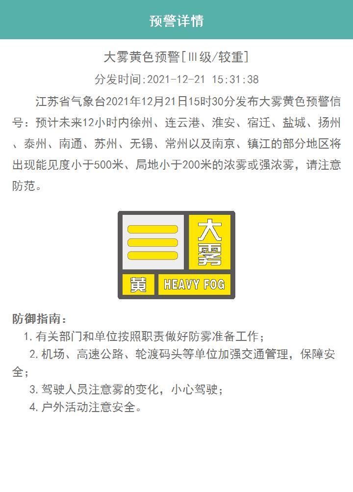 我苏网讯 据@江苏气象 消息,江苏省气象台2021年12月21日15时30分发布大雾黄色预警信号:预计未来12小时内徐州、连云港、淮安、宿迁、盐城、扬州、泰州、南通、苏州、无锡、常州以及南京、镇江的部分地区将出现能见度小于500米、局地小于200米的浓雾或强浓雾,请注意防范。