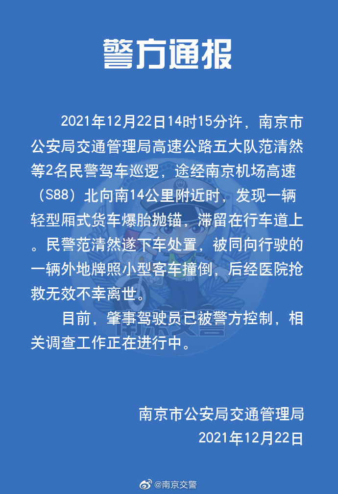 我苏网讯 据南京交警通报,12月22日,南京一名交警执勤时被撞,经抢救无效不幸离世。