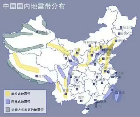 我国的地震主要分布在六个地区的23条地震带上。这六个地区分别为:台湾省及其附近海域;西南地区,主要是西藏、四川西部和云南中西部;西北地区,主要在甘肃河西走廊、青海、宁夏、天山南北麓;华北地区,主要在太行山两侧、汾渭河谷、阴山-燕山一带、山东中部和渤海湾;东南沿海的广东、福建等地;吉林、黑龙江的东部。