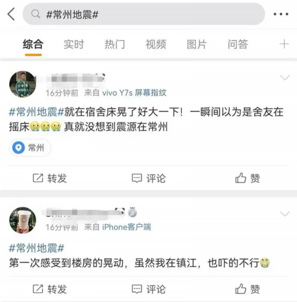 地震发生后,除江苏常州外,无锡、镇江等地的网友表示感觉到了地震。江浙沪多地网友均表示,感觉到了震感。