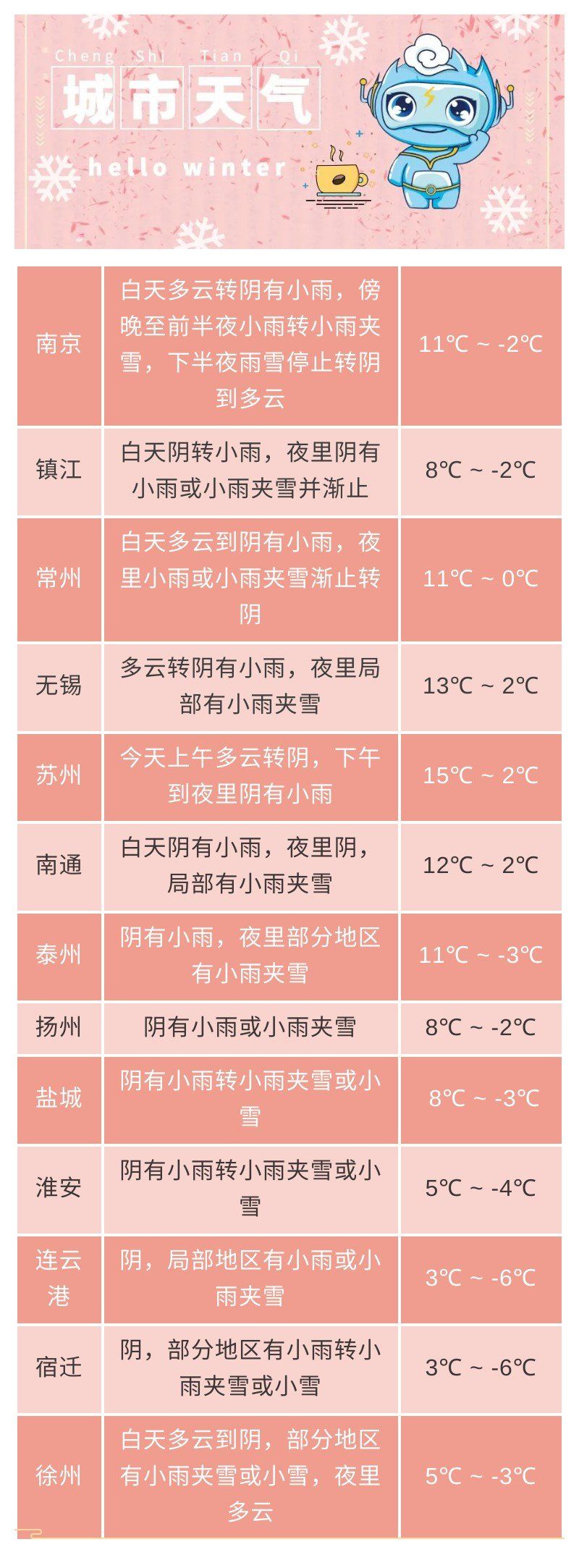 据@徐州气象消息,12月24日09:30全市气温在0-2℃左右,丰沛县以及睢宁地区出现降雪。今天江苏阴有小雨转雨夹雪或小雪。受冷空气影响,全省气温将明显下降,大部分地区48小时最低温度降幅可达10℃左右。