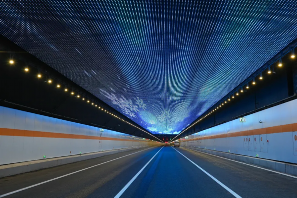 看到侧墙用“蓝”“黄”“绿”三种色带装饰元素了吗,色带间采用几何渐变条带衔接宛如飘带,这其实就是隧道设置的智能视觉系统,它能有效缓解驾驶员的疲劳感哦。