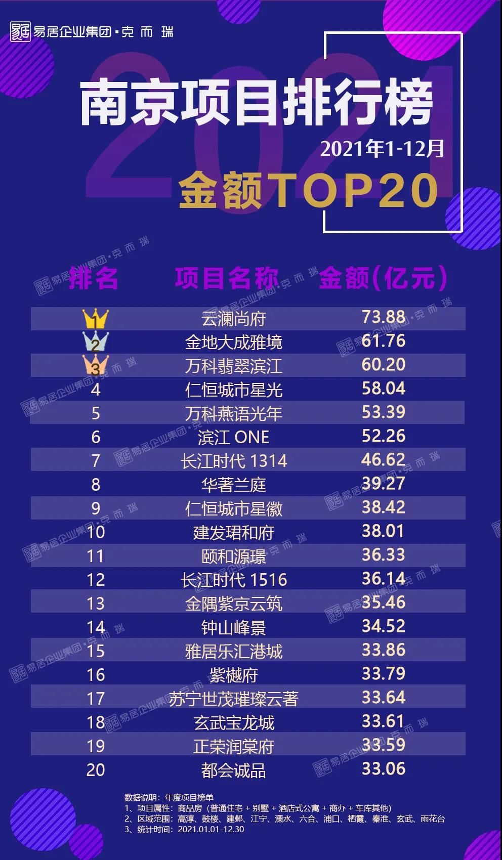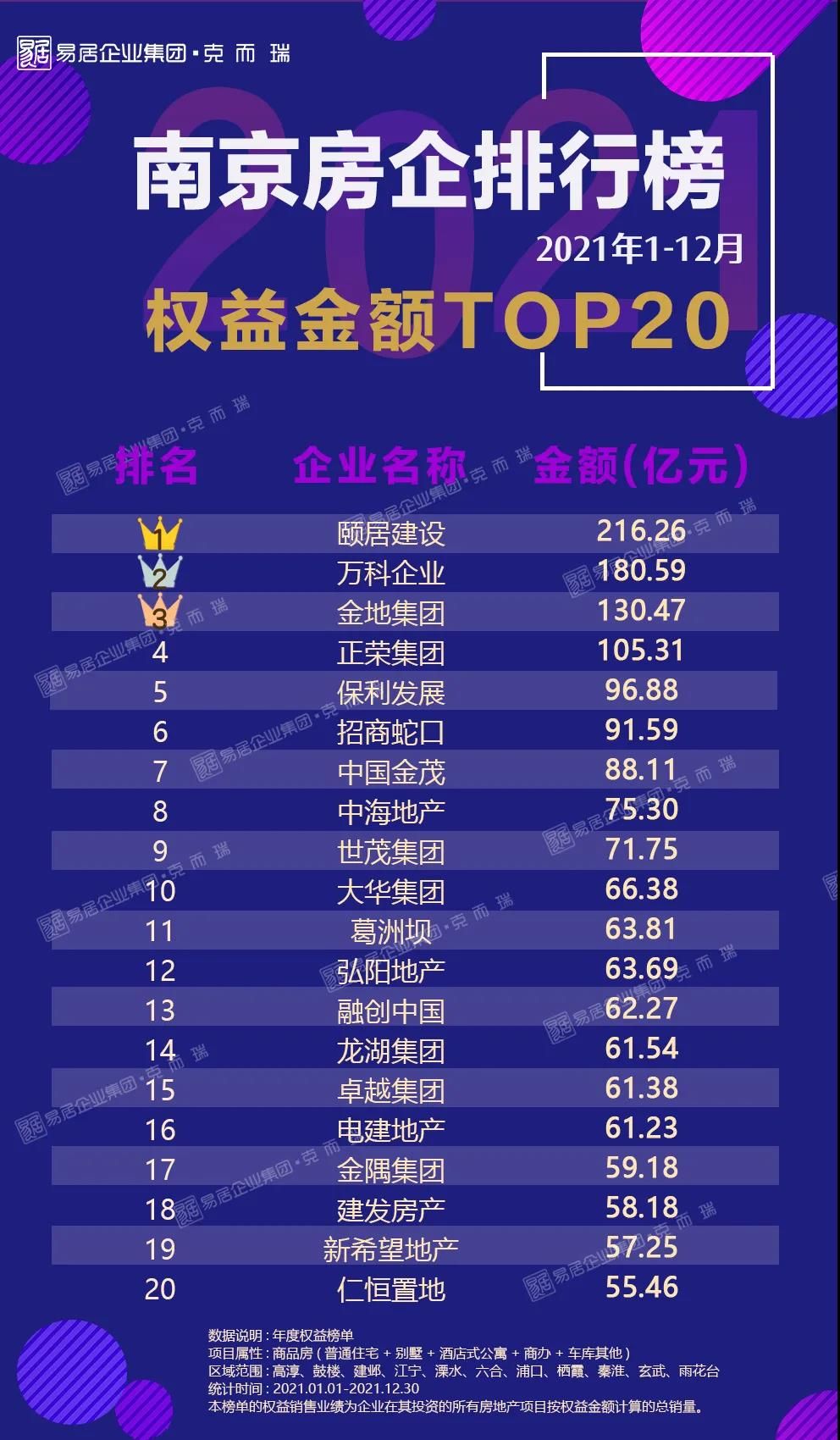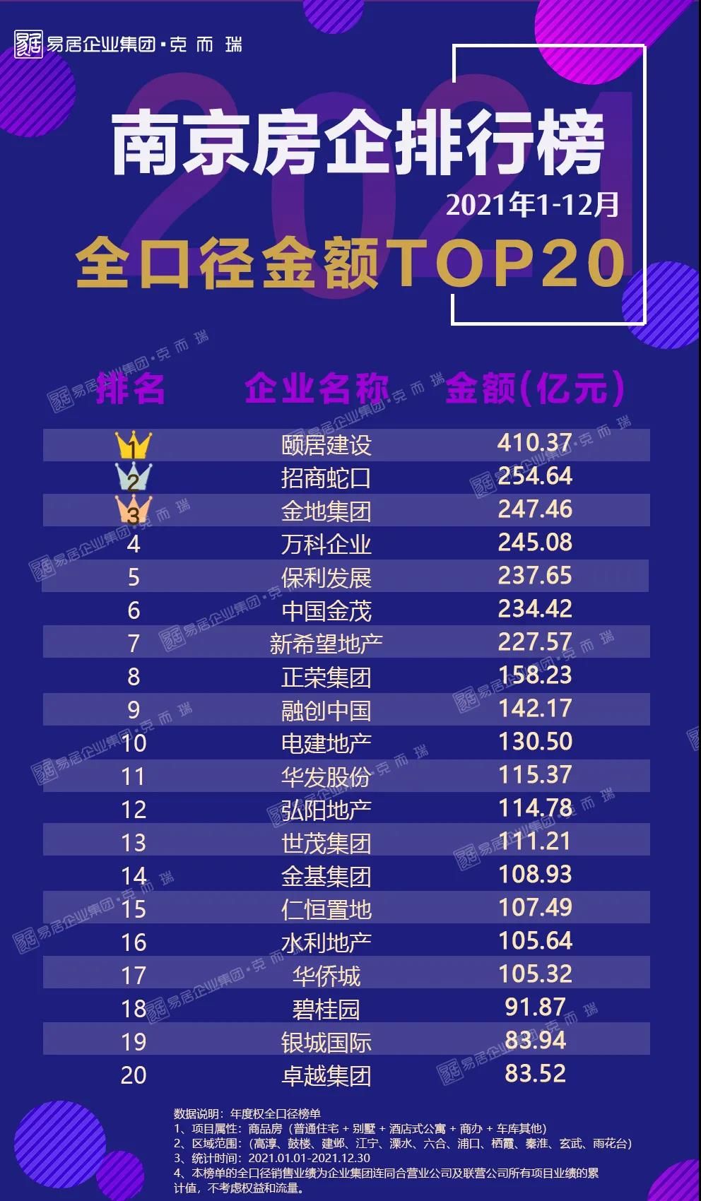 2021年榜单已揭晓,全口径和权益榜排位首当其冲的是颐居建设,凭借旗下的颐和铂湾、颐和源璟、江山荟等20个项目强势突围,年度全口径金额达到410.37亿元,业绩位居上榜企业之首。除此之外还有诸如金地、万科、金茂、保利等深耕南京的“熟面孔”。
