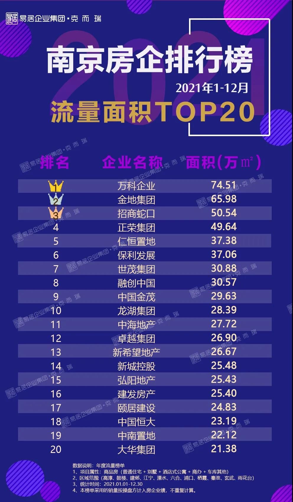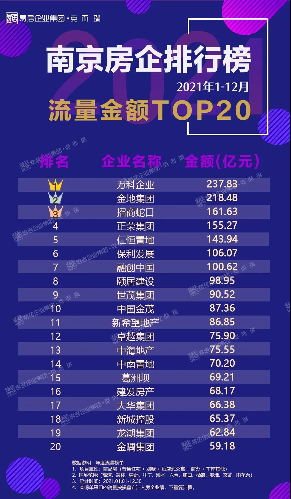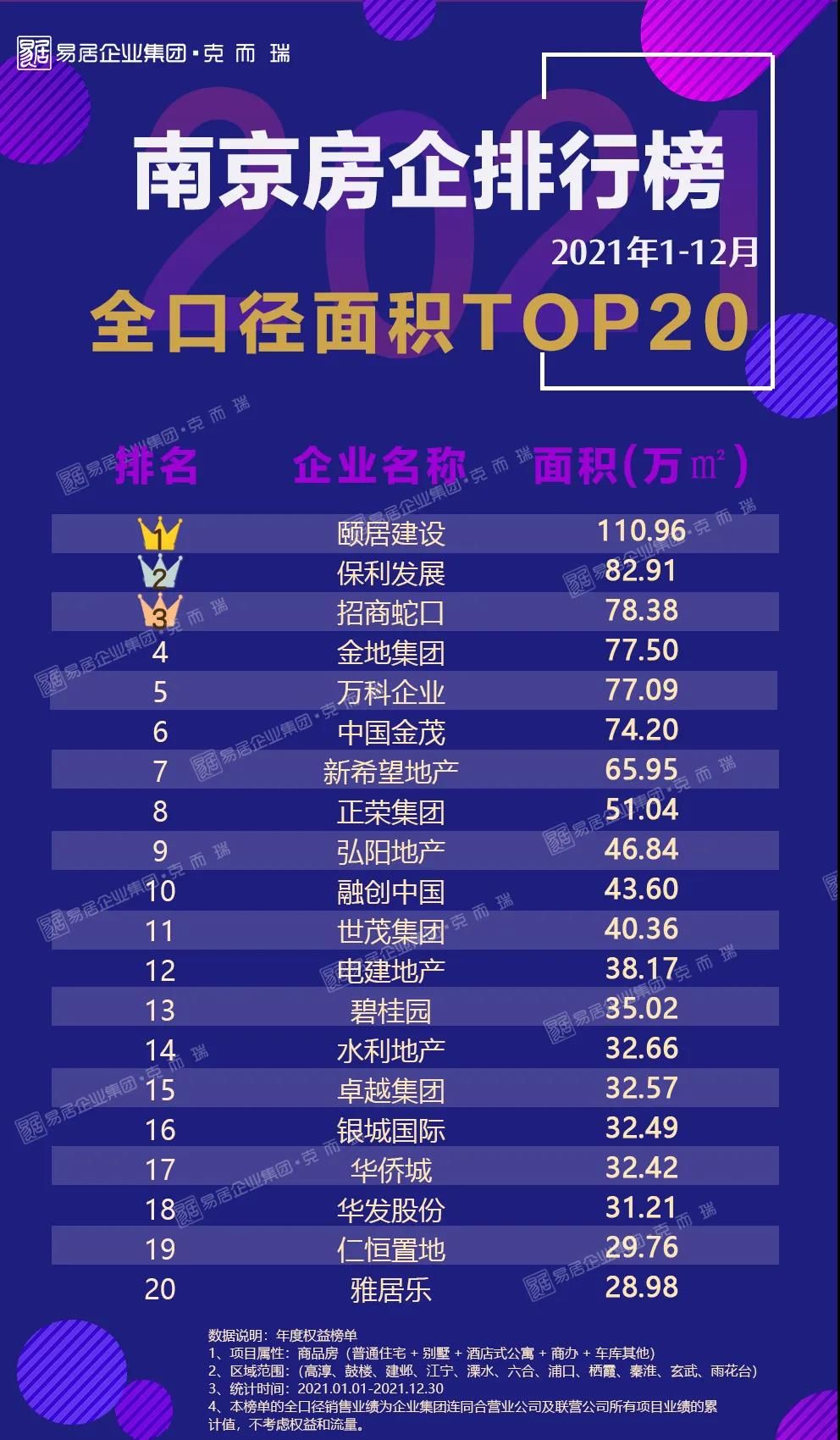 2021年榜单已揭晓,全口径和权益榜排位首当其冲的是颐居建设,凭借旗下的颐和铂湾、颐和源璟、江山荟等20个项目强势突围,年度全口径金额达到410.37亿元,业绩位居上榜企业之首。除此之外还有诸如金地、万科、金茂、保利等深耕南京的“熟面孔”。