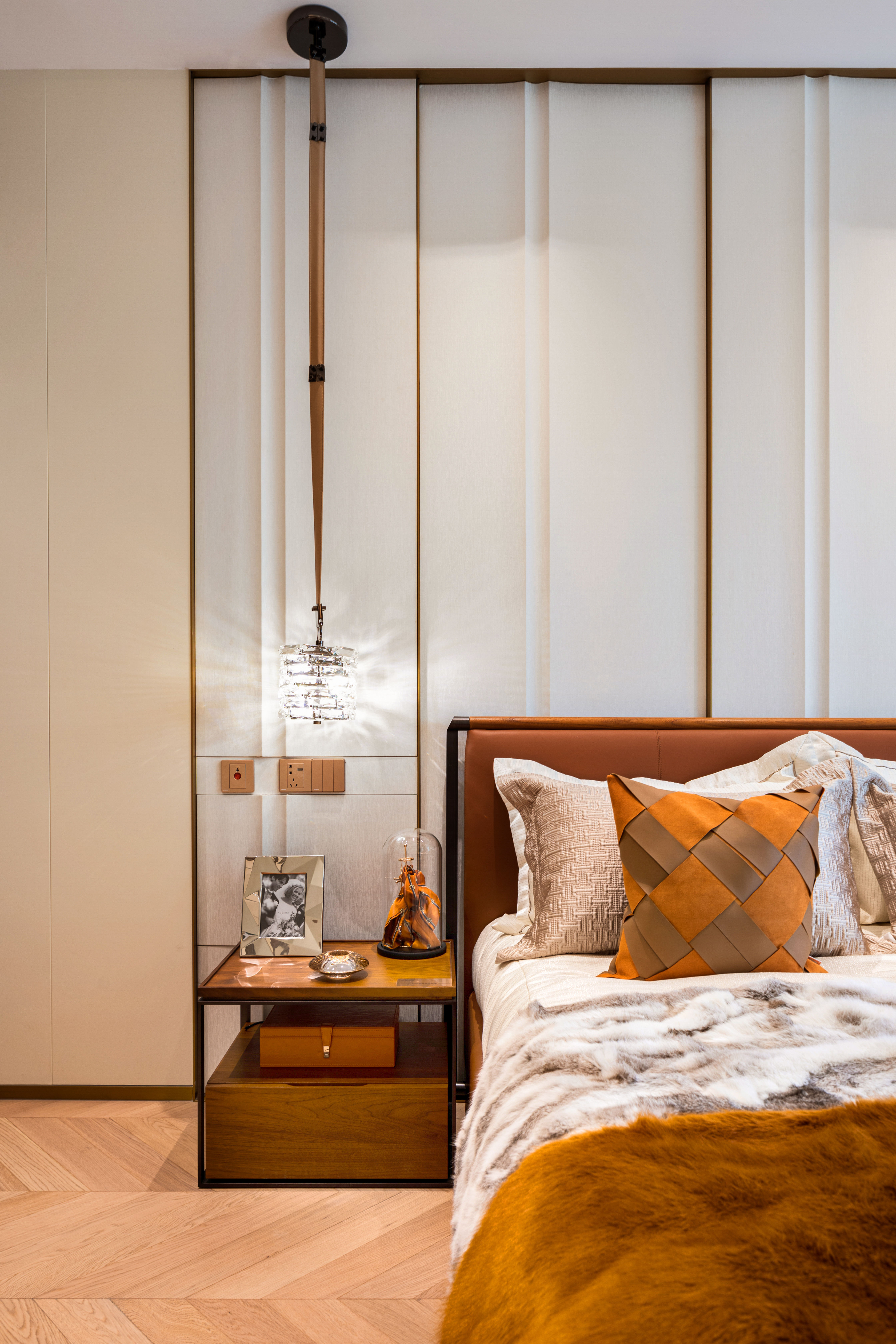 室内墙面采用获国家“十环认证”的木塑护墙板,配以造价昂贵的木纹设计,不同角度能够折射出不同的光泽和纹路,于细节处透露出独属于这一空间的高贵气质。经过精心计算后鱼骨拼接的卧室木地板,给予身心更多宁静与和平感受。