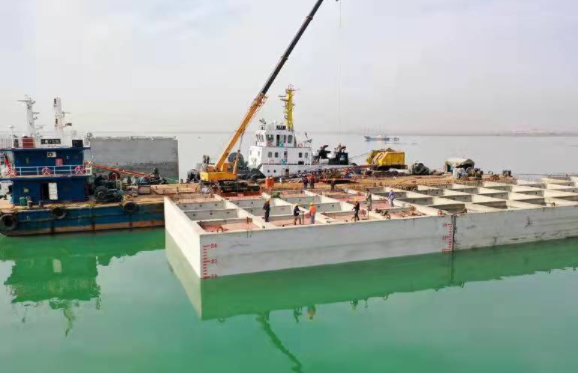 半潜驳是一种装载甲板可浮出水面也可沉入水下的大型特种海运船舶。与潜艇不同,半潜船不能完全潜入水中,潜水时仍有部分船体或结构外露在水面上。借助这种沉浮功能,它能使装卸、运载海上大型设备变得轻松不少。连云港港赣榆港区4至6号散货泊位是在建的国内最大的专业化镍矿装卸泊位,同时,也是省内最大的沉箱结构码头。沉箱出运及安装工程量极大,需要借助半潜驳拖带沉箱到达安放位置。