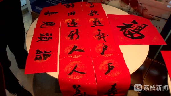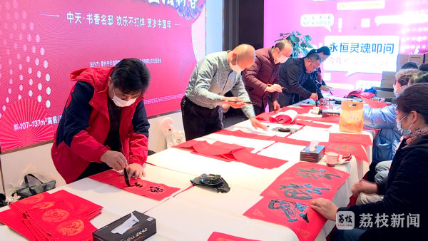泰州市南社文化促进会在海陵区一小区举办了"书香祈福运、泼墨绘新春"活动。当天,书法家们共书写300多副春联、150多张"福"字,并把这些新春祝福送给现场市民。