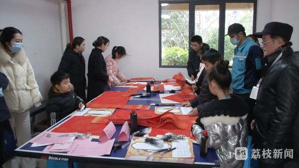 一些书画爱好者泼墨挥毫,书写春联、"福"字,传递新春祝福。物业还准备了一些便民活动,有量血压、磨菜刀、修理小家电等等。