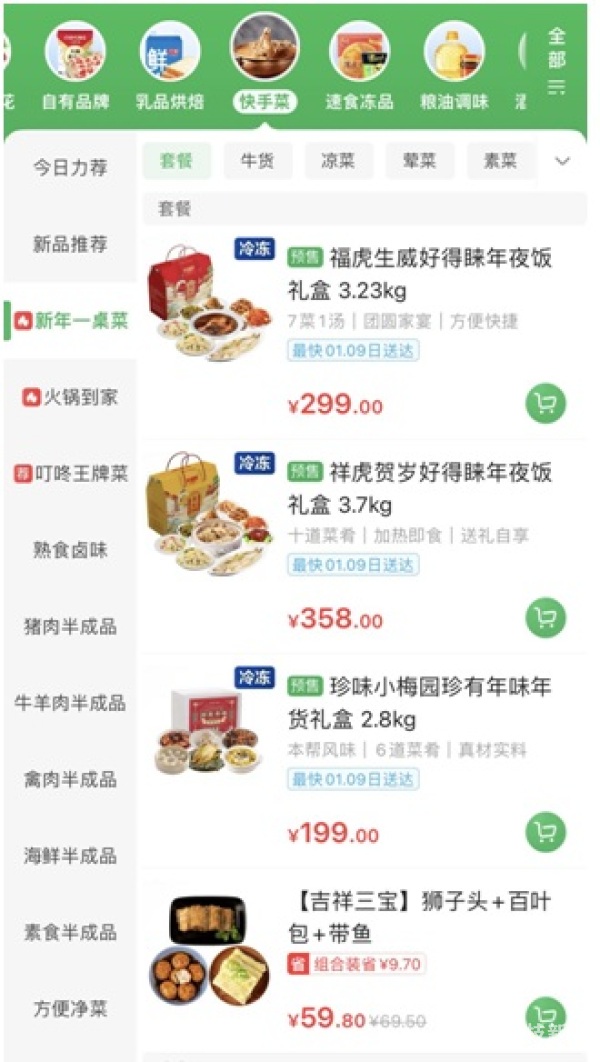 比如一款“内蒙古炭烤风味羊后腿”,虽然是一道北方菜品,但也进入了江苏消费者的年夜饭菜品前十名,每天销售量超过数千份。这款快手菜,选用内蒙古乌拉盖草原上散养的黑头羔羊,羔羊们吃乌拉盖河边的水草、药草长大。采用恒温炭烤的方式,锁住汁水不流失,还原大草原的风味,满足大家过年大口吃肉的愿望。