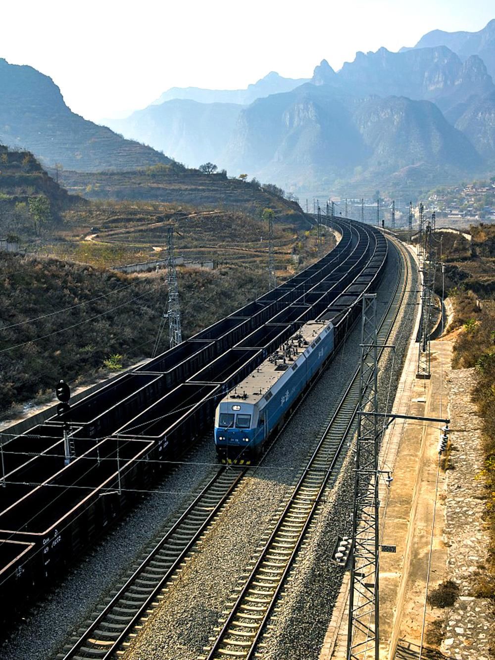 △一列满载煤炭的列车通过中南铁路长治平顺县段。中南铁路西起山西吕梁,东至山东日照港。(图/视觉中国)