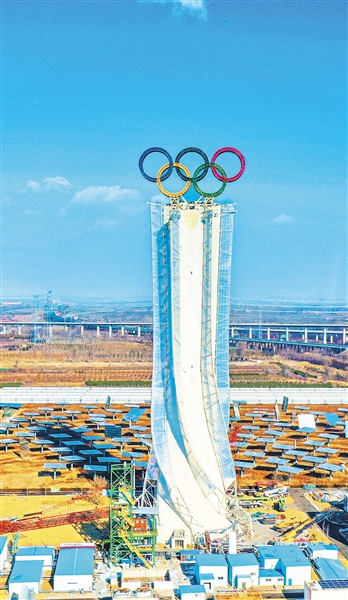 ④北京冬奥会延庆赛区标志性景观——“海陀塔”。塔顶的“奥运五环”和围绕在塔身的“冰晶飘带”,绽放冰雪魅力,展现冬奥之美。张武军摄(中经视觉)