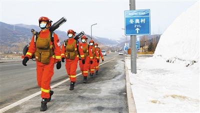 ③驻守在河北省张家口市的黑龙江省森林消防总队消防救援人员,在崇礼核心赛区场馆外围进行森林防火巡护。于 珂摄(中经视觉)