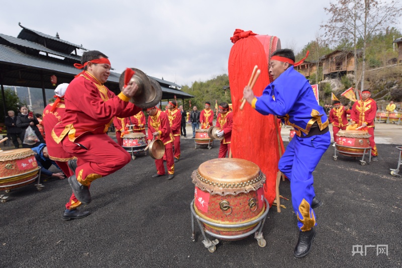 岑巩县大有镇木召生态旅游度假区,村民们敲响思州战鼓庆新春(央广网发 唐鹏 摄)