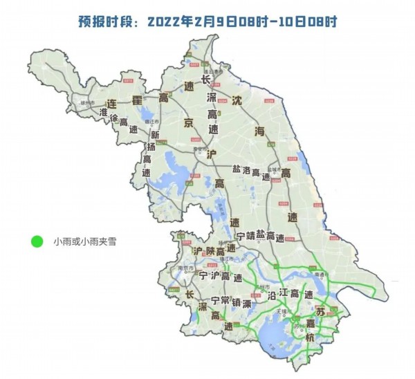 9日08时-10日08时,本省沿江和苏南地区有小雨或小雨夹雪,受弱雨雪影响的路段有东部高速南段、宁通、广靖锡澄、宁常镇溧、宁杭、沪宁、沿江等,需注意弱降水带来的路面湿滑。