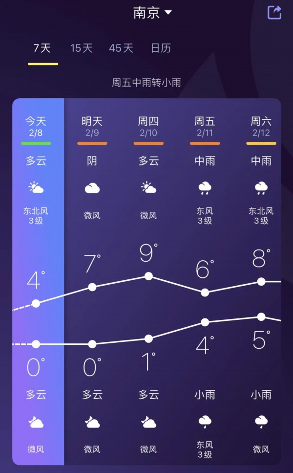 2月9日沿江和苏南地区多云转阴,有小雨或小雨夹雪,其它地区多云