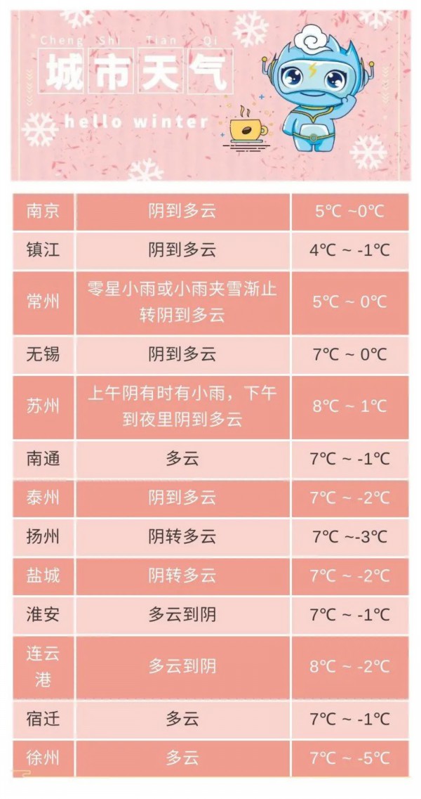 明晨最低温度:苏南南部地区0℃左右,其它地区-3℃左右,局部有冰冻
