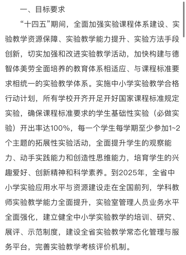 1、实施中小学实验教学合格行动计划。推进所有学校开齐开足国家规定的实验课,全面保障实验开展的基本条件。到“十四五”末,全省中小学基础性实验(必做实验)开出率和实验仪器配备率均达100%。