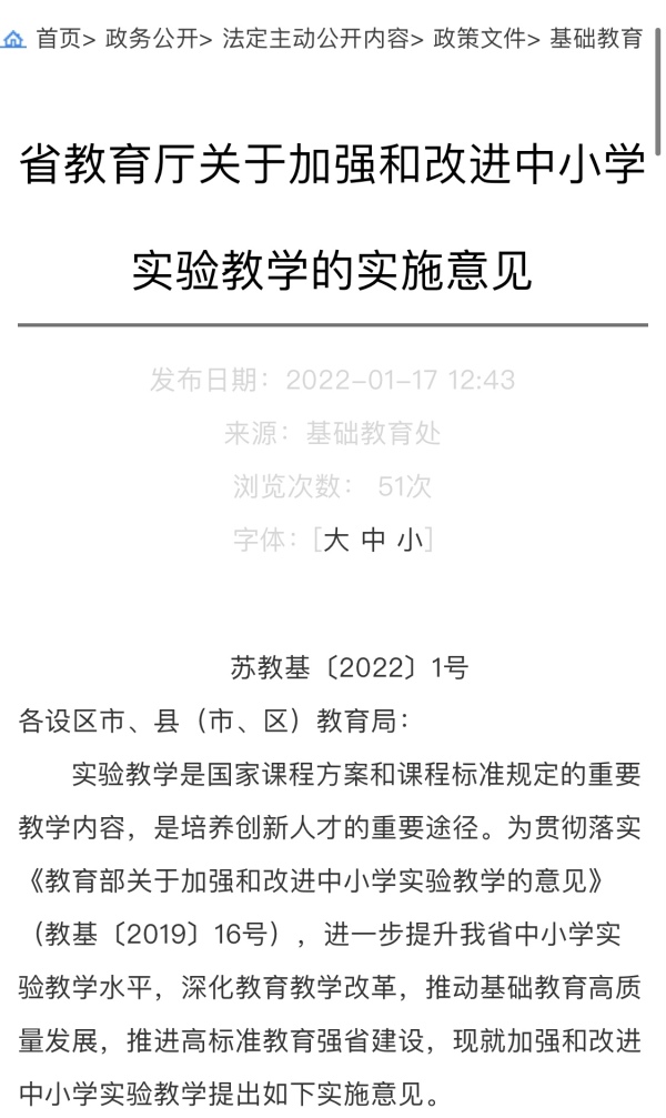 实验教学是国家课程方案和课程标准规定的重要教学内容,是培养创新人才的重要途径。记者今天从江苏省教育厅获悉,为贯彻落实《教育部关于加强和改进中小学实验教学的意见》(教基〔2019〕16号),进一步提升我省中小学实验教学水平,深化教育教学改革,推动基础教育高质量发展,推进高标准教育强省建设,近日,省教育厅印发了《关于加强和改进中小学实验教学的实施意见》,提出六大举措和四项工程(计划)。