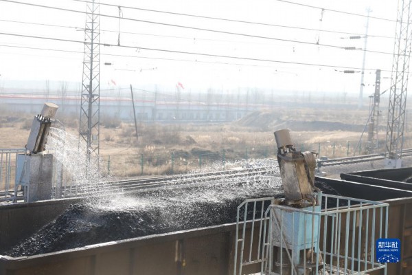 在塔山煤矿的装车站,列车上的煤堆被喷洒抑尘剂(1月19日摄)。新华社记者 陈志豪 摄