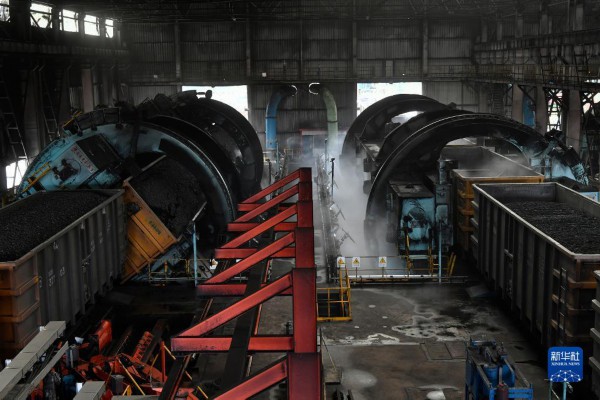 在河北省秦皇岛柳村南站的翻车机房,翻煤机将车厢内满载的煤炭倒进传送带(资料照片)。新华社发