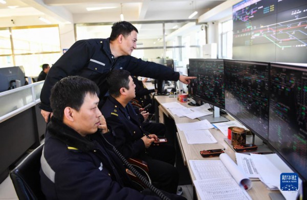 湖东电力机务段咨询室的工作人员在指挥前方的车辆(1月18日摄)。新华社记者 柴婷 摄