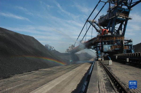 在河北省秦皇岛柳村南站,装船机在取料进行装船作业(资料照片)。新华社发