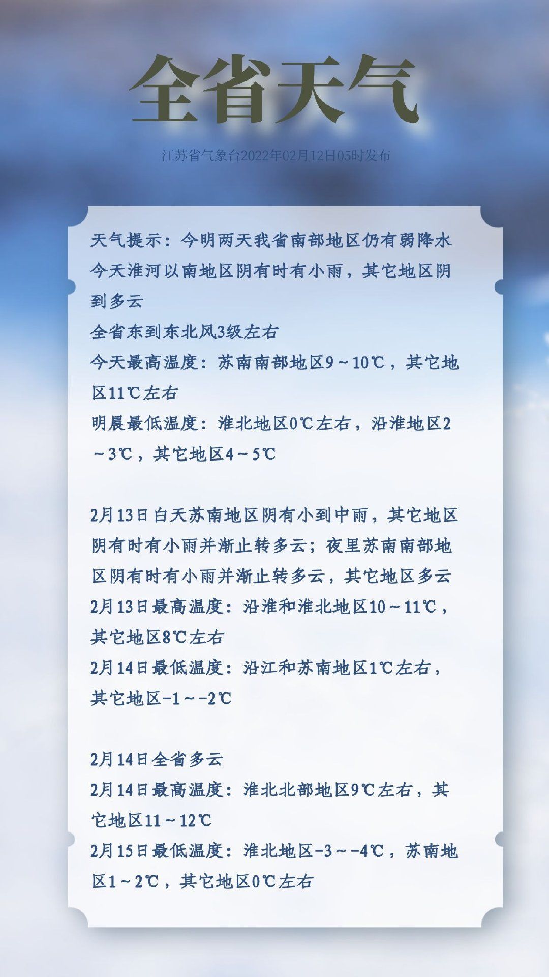 今天淮河以南地区阴有时有小雨,其它地区阴到多云,全省东到东北风3级左右,今天最高温度:苏南南部地区9~10℃,其它地区11℃左右,明晨最低温度:淮北地区0℃左右,沿淮地区2~3℃,其它地区4~5℃。