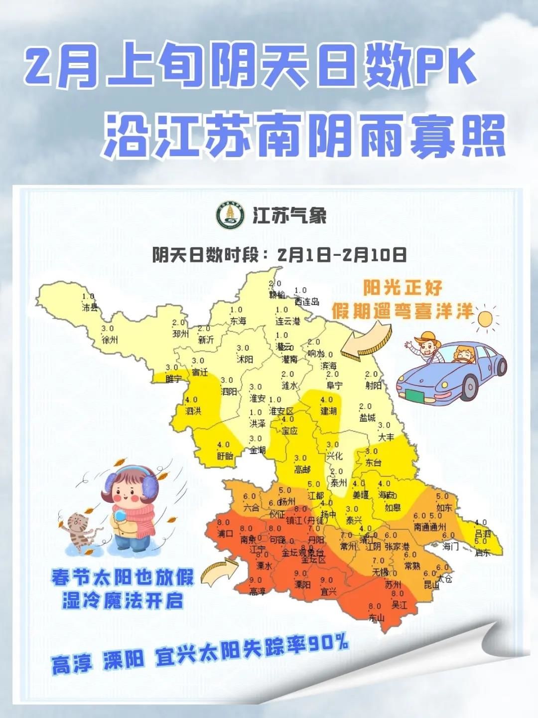 截止10日,我省的高淳、溧阳、宜兴阴天大满贯,太阳失踪率高达90%,苏南地区阴天数均在5天以上,苏北地区则阳光满满。