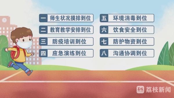 市教育局发布通知,要求开学前,学校要切实做到“八个到位”:一是师生状况摸排到位;二是教育教学安排到位;三是防疫培训到位;四是应急演练到位;五是环境消毒到位;六是饮食安全到位;七是防护物资到位;八是沟通协调到位。开学后,学校要严格落实常态化疫情防控要求,做好七个方面的工作:一要严把学校入口关,严控外来人员、车辆入校;二要严格执行“零报告”“日报告”制度;三要继续落实常态化核酸检测,有序推进疫苗接种;四要严格校内人员管理;五要强化卫生健康教育;六要严格校园环境清洁消毒;七要做好应急处置工作。