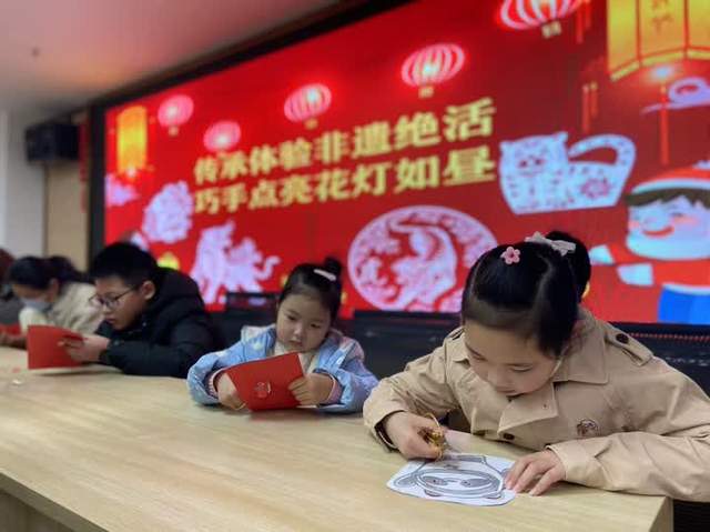 “孩子们,大家看冬奥会了吗?我们今天就将非物质文化遗产剪纸与冬奥会精神结合起来……”做完花灯,扬州剪纸传承人赵红妹向孩子们展示了自己刚刚创作的剪纸作品——冰墩墩。在她的指导下,孩子们操刀上阵,一张张憨态可掬的剪纸版“冰墩墩”呈现在眼前。