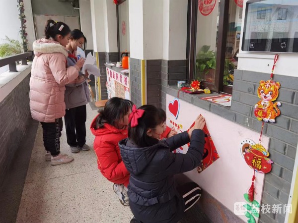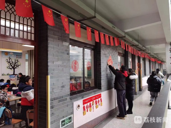 一大早,南京市考棚小学校园里,处处洋溢着节日的氛围,从教室到走廊,在老师的带领下,学生们忙着贴“福”字,贴窗花,挂春联,挂灯笼。三(4)学生任君炎说,看着充满年味的校园特别开心:“有些是同学们从家里带来的,还有大家自己动手制作的灯笼。听说明天开学典礼上还有惊喜,我更加期待了。”