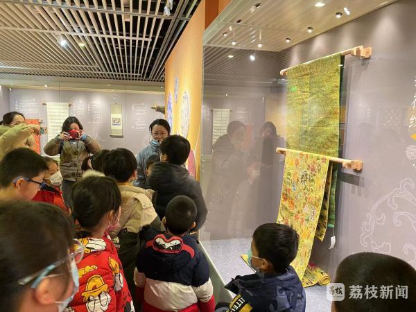 在江宁织造博物馆的“世界非物质文化遗产南京云锦艺术展”,公共服务部教育员刘慧焱以生动有趣的互动方式,给小朋友们介绍着南京云锦的历史由来。