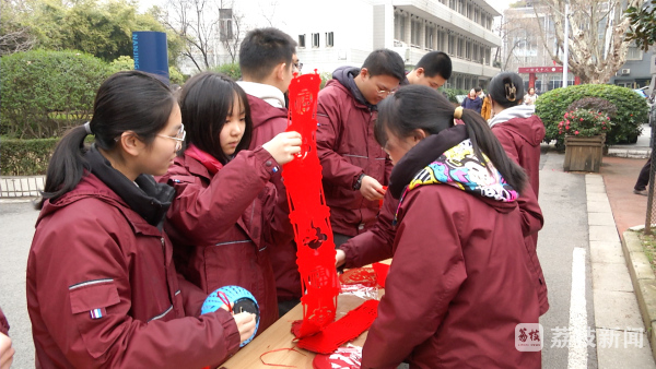 在南京市第九中学,校学生会采购了各种年俗物件,在校园里以"年俗市集"形式亮相,春联、年画、风筝、中国结……引来同学们驻足选购。
